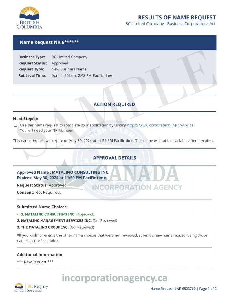 Some provinces require name pre-approval (e.g., BC, Quebec), while others recommend it. It’s also required for federal incorporation if you’re not using a numbered company.