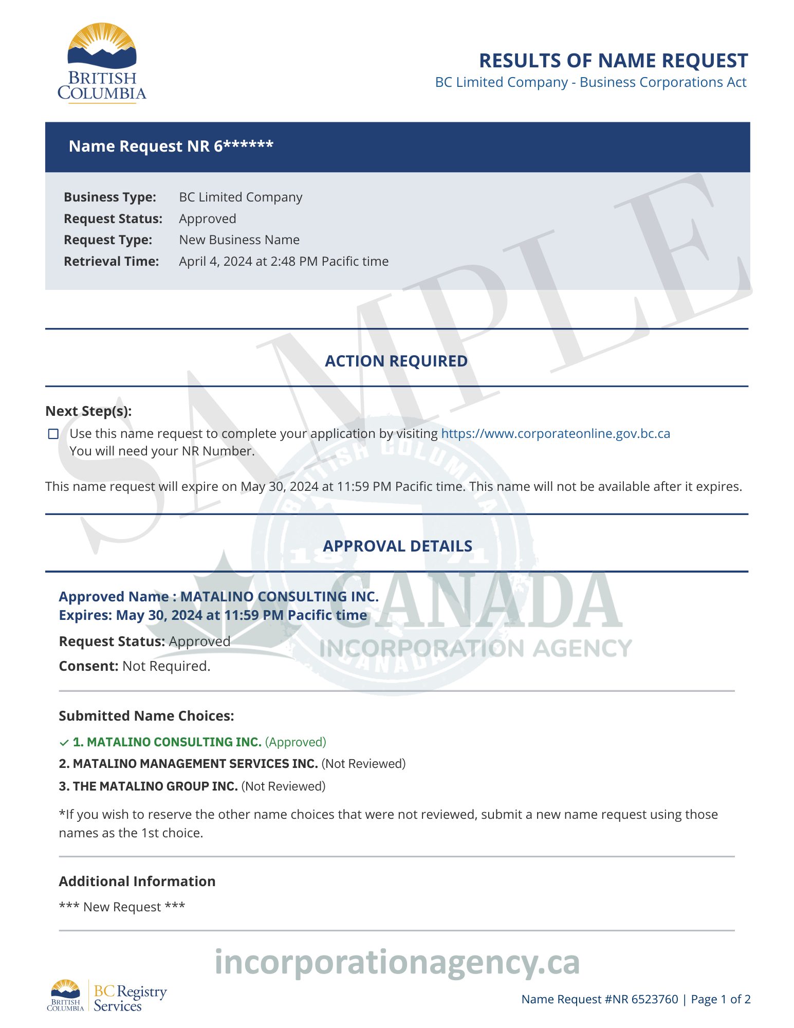 Thinking of starting a business and want to lock down your name early? Our Business Name Pre-Approval Service helps ensure your proposed business name meets provincial or federal naming guidelines—before you commit to incorporation or branding.