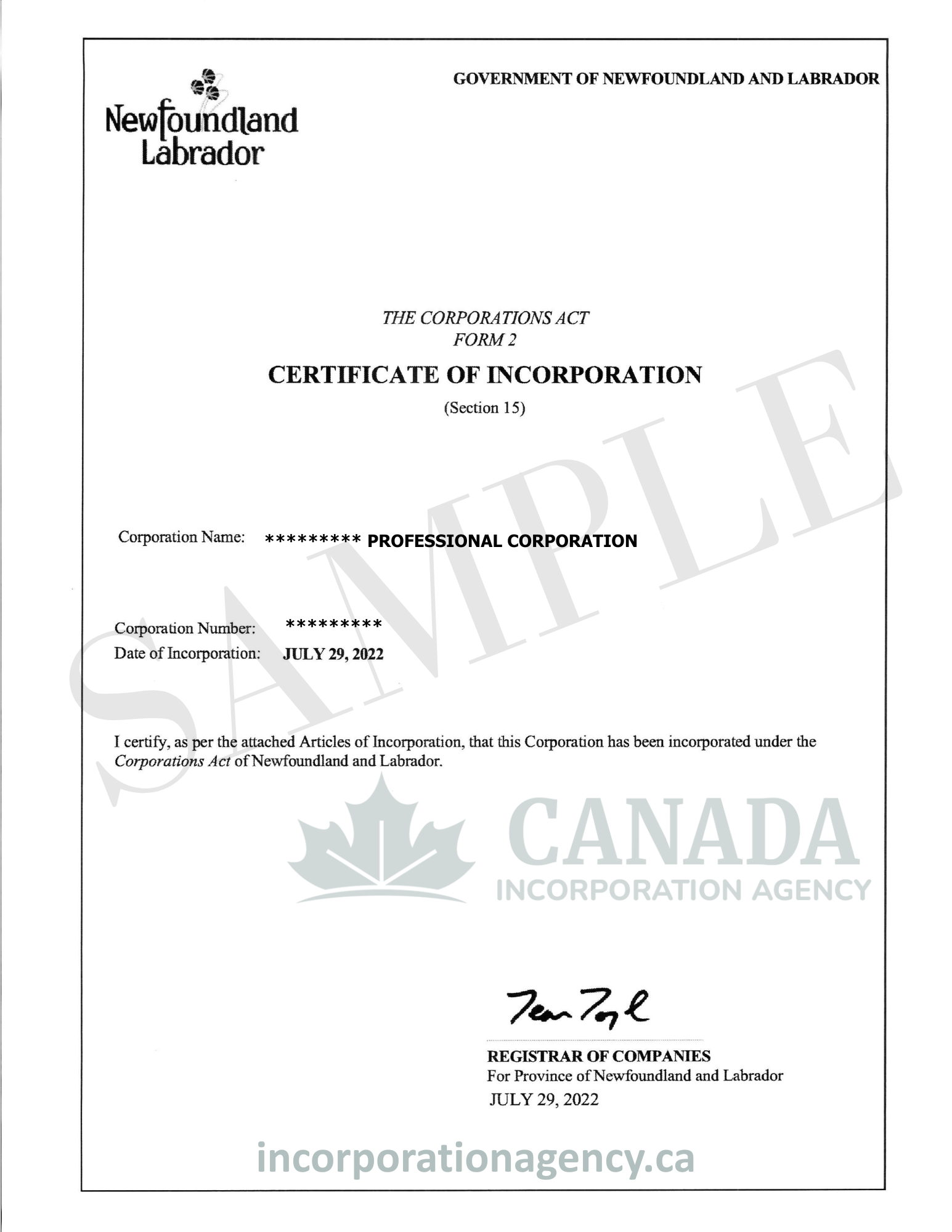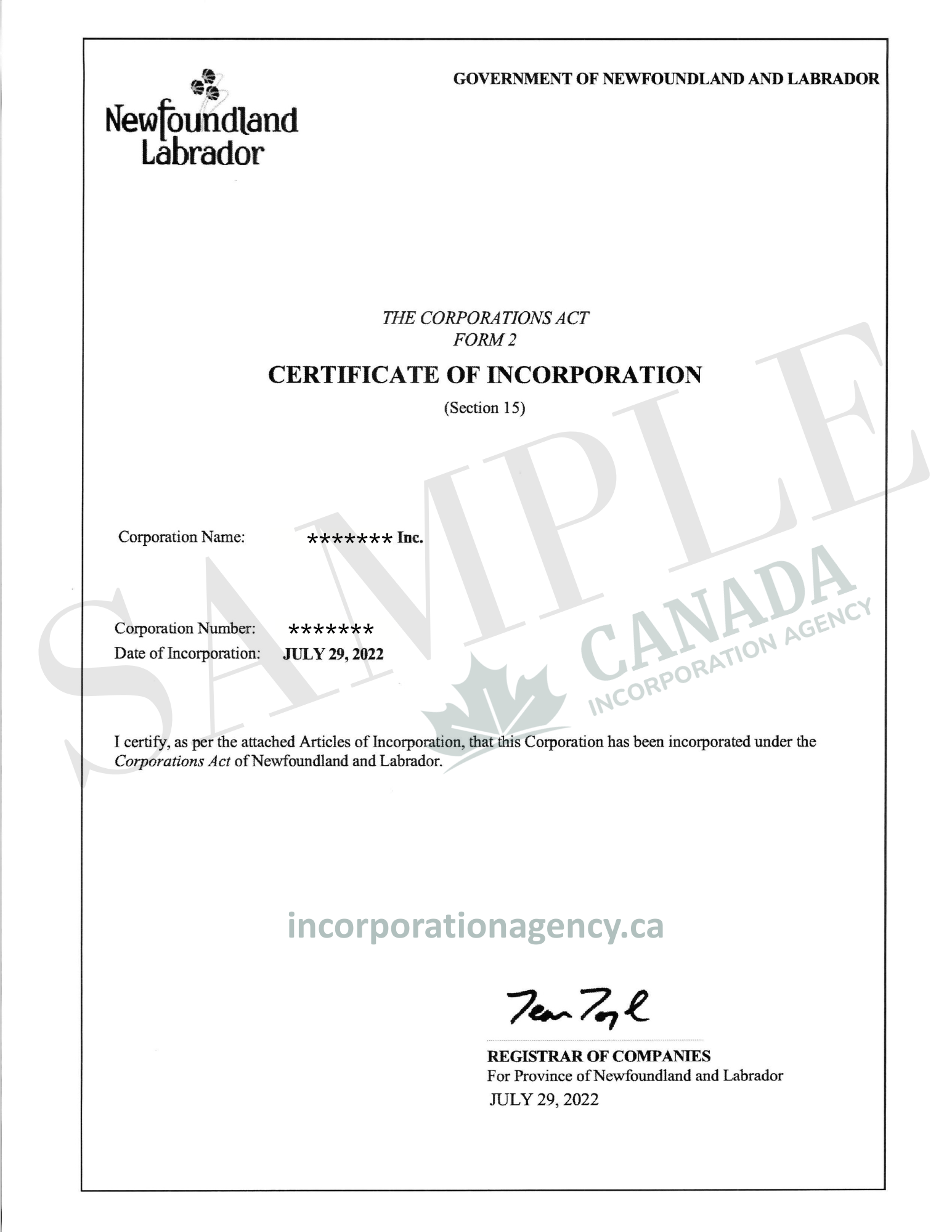 incorporate in Newfoundland