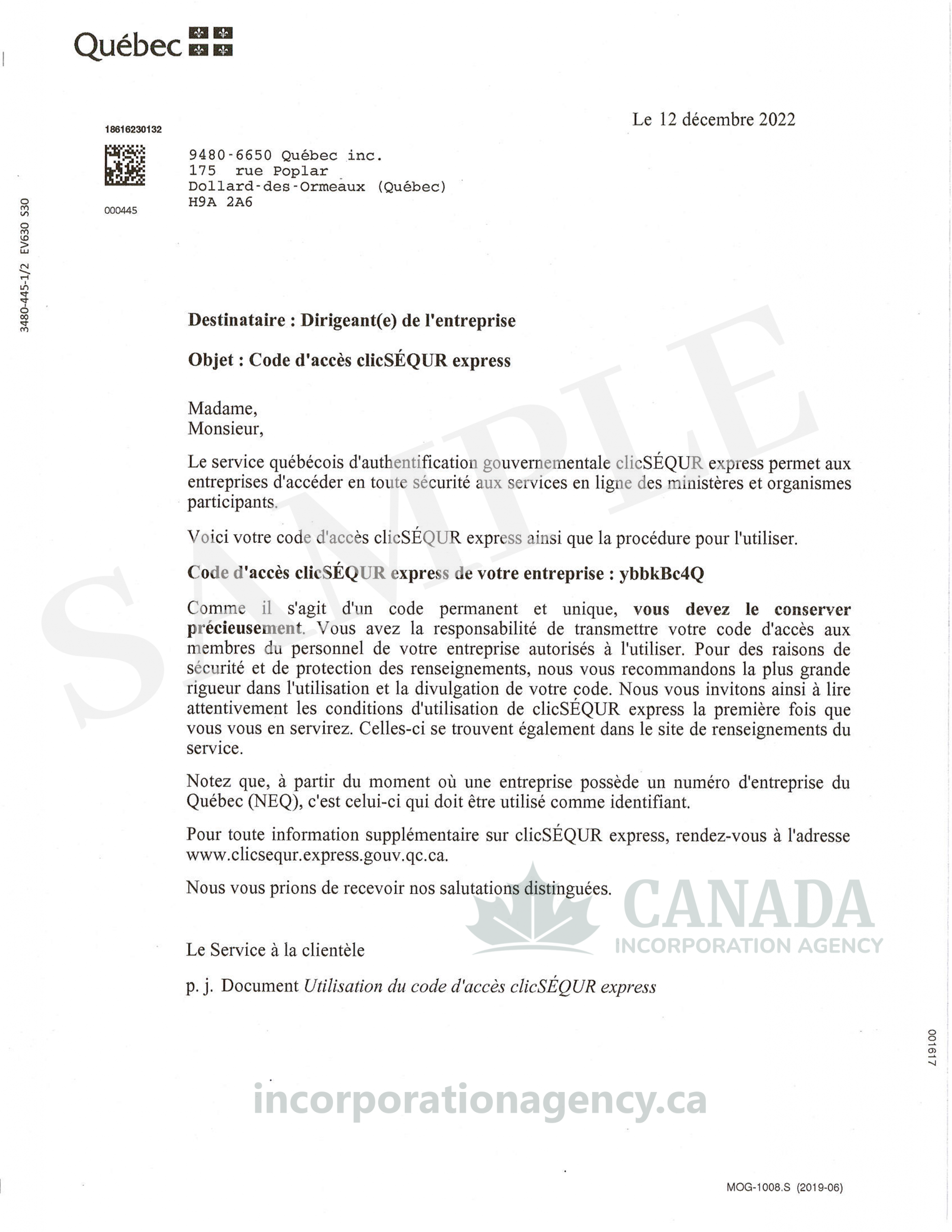 You can request your Express Code through the Registraire des entreprises du Québec (REQ) website or by submitting a request through our Canada Incorporation Agency website. We process your Corporation Key request within 1 hour of receiving your order.
